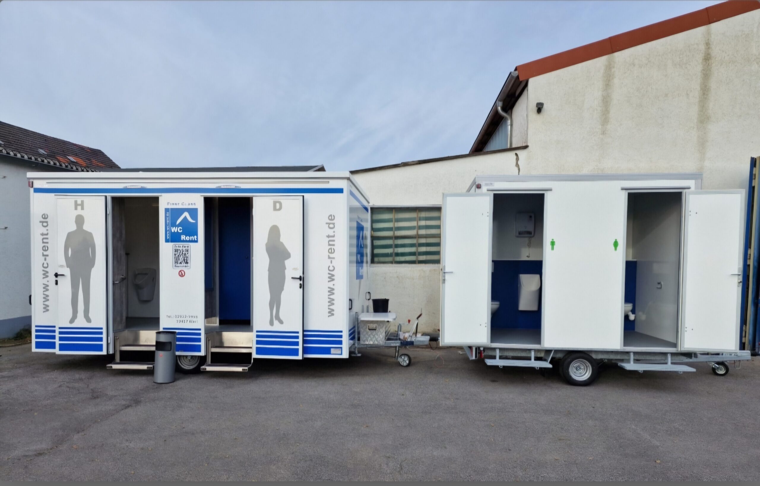 Unsere WC-Schnell Toilettenwagen sind Verfügbar! Der große Toilettenwagen hat für die Männer und Jungs, eine Toilette und 4 Urinale. Bei den Frauen und Mädchen sind es drei Toiletten. Der kleinere Toilettenanhänger hat jeweils eine Toiletten, ist dafür aber sehr sehr groß und perfekt für umfangreiche Kostüme/Brautkleider etc. geeignet. Beiden Wagen benötigen Zugang zum Strom und Kanalnetz.